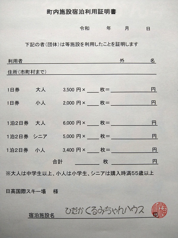スキー場の割引証明書